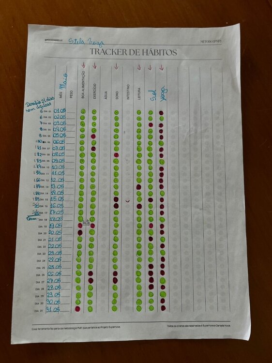 Boa tarde herdeiras, me propus a postar o tracker de hábitos do meu primeiro mês completo. Eu estou me sentindo muito feliz de conseguir concluir pois no mês anterior além de eu começar na metade do mês me esqueci de marcar alguns dias. Algo que me ajudou a não esquecer foi deixar a folha a vista na minha mesa de trabalho. Pretendo esse mês fazer o trackeamento no Notion. Empilhei o hábito angular da atividade física com a boa alimentação(foquei em fazer melhores escolhas alimentares associadas ao meu ritmo de treino de corrida e musculação) e é impressionante como de fato um hábito leva a outro…quando penso no meu cardápio já associo com meu objetivo com os treinos e já penso que isso vai me ajudar a ter uma boa noite de sono que vai me proporcionar a acordar cedo e dar continuidade em todo o processo. Eu tenho me sentido muito feliz em realizar essas pequenas mudanças que apesar de serem pequenas são bem desafiadoras pra mim…continuo com o objetivo de melhor 1% a cada dia! Eu confesso que olhando essa folha totalmente preenchida me motiva a continuar porque consigo ter um direcionamento real de em qual área eu preciso focar no próximo mês. Fiquei com uma dúvida com relação a marcação do hábitos que não planejei que fossem diários(por exemplo 3x na semana) os dias que eu não for fazer eu devo marcar de vermelho também? Me comprometo a postar meu tracker do Notion no primeiro dia do mês que vem! Quem vem comigo?! Boraaaa🔥🔥🔥🔥5 pontos