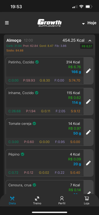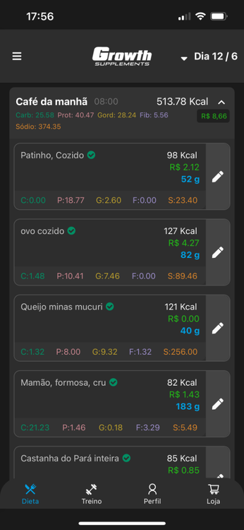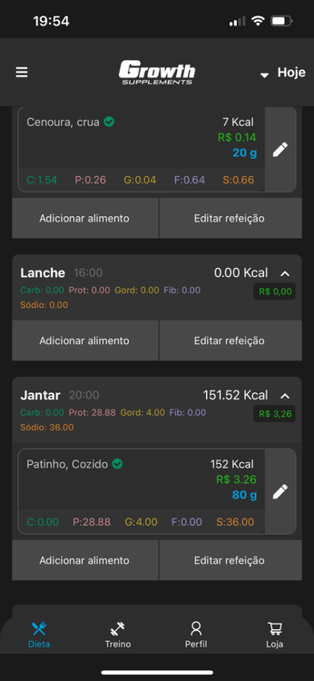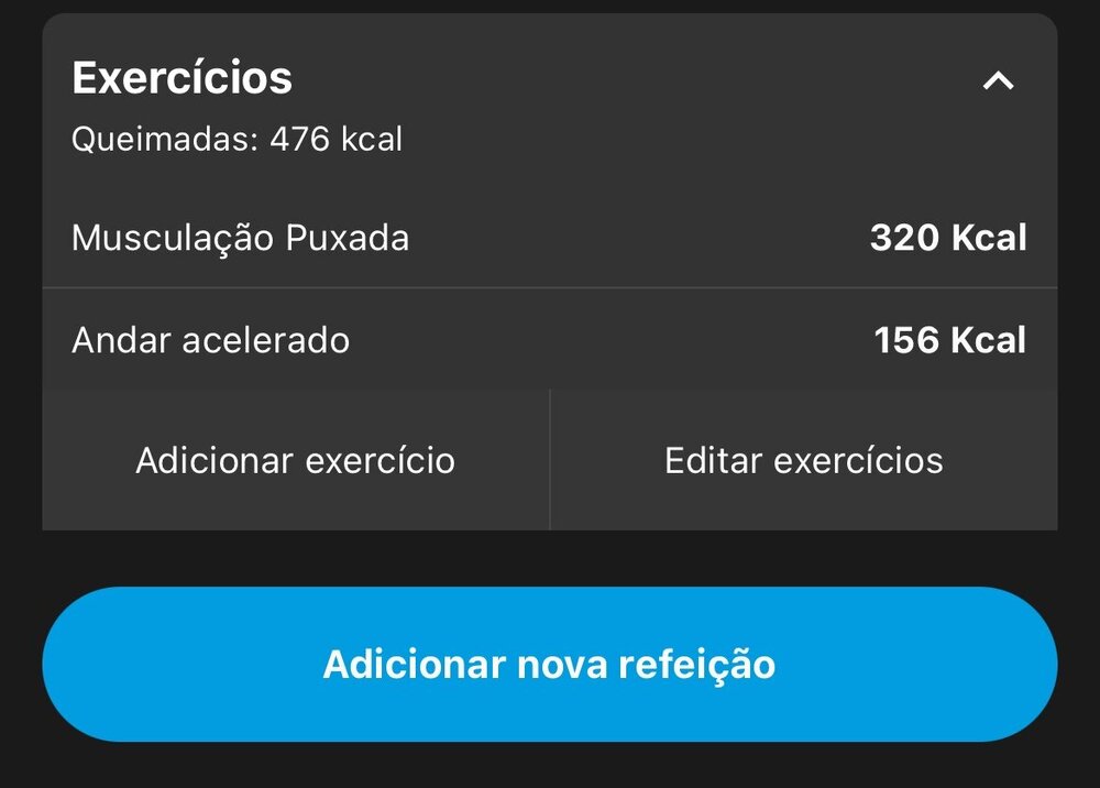 Dia 06 Peso 76.5 kg Exercício: musculação 45 min - 327kcal (aproximadamente) Hoje alimentação também não foi legal, tive um evento de manhã, deixei pra comer lá, comi besteira à tarde. Amanhã é outro desafio: festa junina na agência. Não sei o que está errado, ainda estou encafifada com as calorias no app, estou pesando tudo que posso, não estou sentindo fome, mas não bate a quantidade de kcal.1 ponto