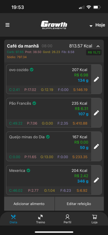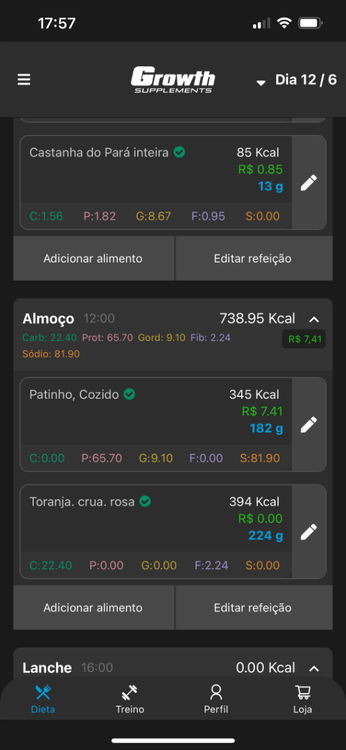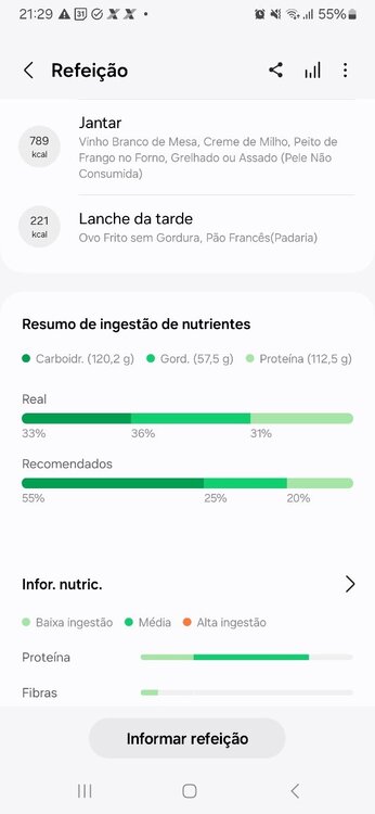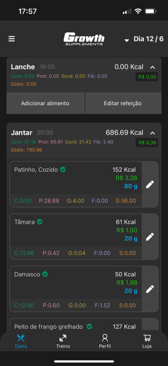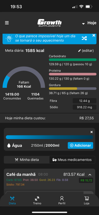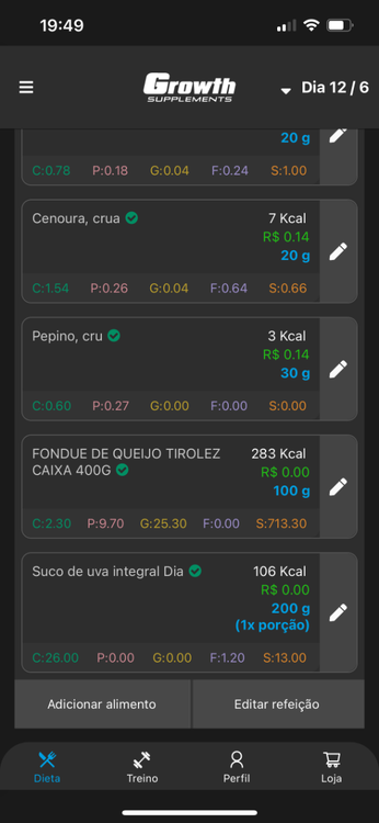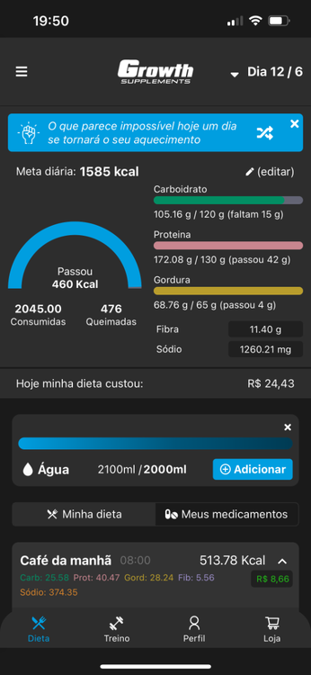 DIA 6 PESO: 53,20kg TREINO: treino de força 320; cardio 156. MACROS BATIDOS: carboidratos 105; proteínas 172; gorduras 68. 1937kcal. Ontem foi dias dos namorados e eu fiz um fondue. Por mais que fiz substituições eu consumi mais calorias que o planejado. Substitui o vinho pelo suco de uva integral, as torradas pelo pepino e cenoura e o chocolate por algumas tâmaras com damasco. OBS: meu intestino estava preso há dois dias mesmo eu aumentando o consumo de vegetais, abdômen inchado e gases…depois do queijo do fondue as coisas ficaram ótimas hoje já amanheci na privada! 🫣😅1 ponto