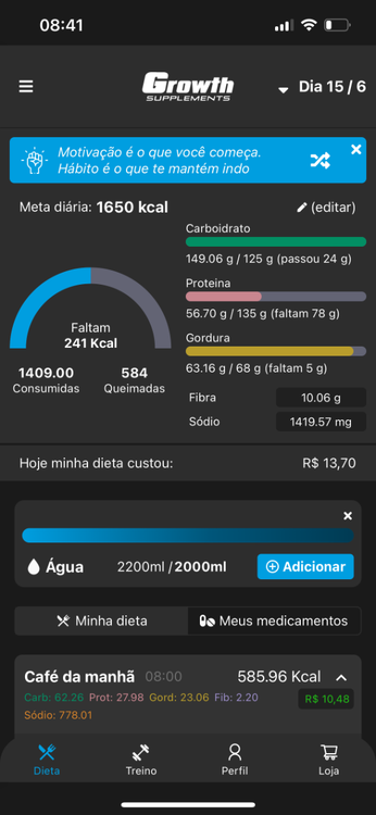 DIA 2 (antigo dia 9 - 15.06) Hoje não deu tempo de comer pela manhã e acabei tendo que bater mais calorias em apenas 2 refeições completas. Não gosto muito de fazer isso, pois acabo me sentindo muito pesada. PESO: 59kg (ainda menstruada) TREINO: Treino de Força 127cal; Zona 2 294cal MACROS BATIDOS: Proteínas 138; Carbos 105; Gordura 80 - TOTAL 1683cal FOTOS:1 ponto