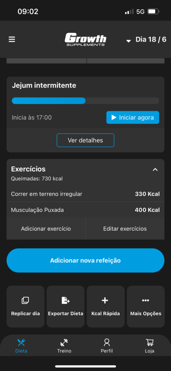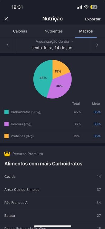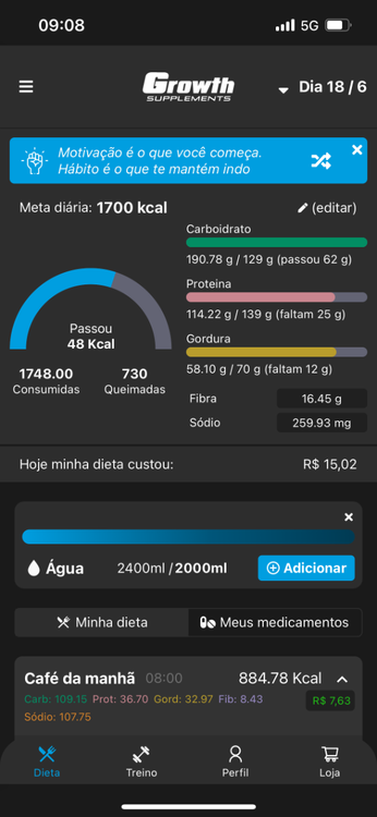 DIA 12(18/06) PESO: 55 (noite)😳 TREINO: cardio 330kcal; treino força 400kcal MACROS BATIDOS: proteína 114; carboidratos 190; gorduras 58 1748kcal 3o dia que aumentei as calorias para a manutenção já voltei para os 55kg. Espero que seja de massa muscular 🤡😅 OBS: Já fazem dois dias que não estou conseguindo bater proteína, apenas não estou conseguindo comer(me sinto cheia). O carbo também deu uma leve aumentada visto que voltei para a manutenção.1 ponto