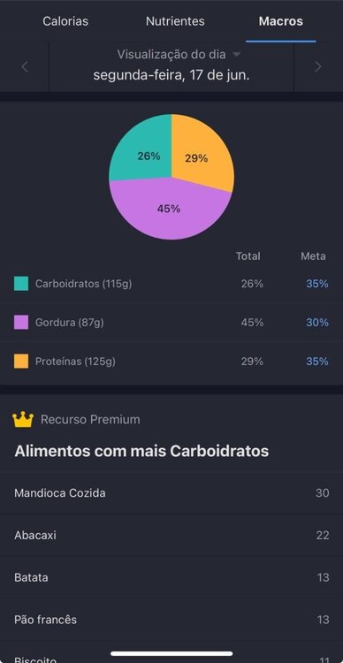 Vim atualizar o diário. Ainda estou com dificuldade de seguir a dieta e minha menstruação começou hoje. dia 09 (17/06) Peso 69 kg Macros batidos proteínas 125g, gordura 87 g, carboidratos 115 g calorias 1720. Esse foi o dia que cheguei perto da meta de macros, mas ainda assim passou as calorias. Não fiz exercício.1 ponto