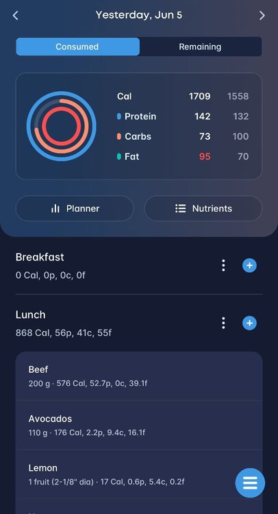 Meninas, estou aqui tentando entender como alimentar o app. E dificuldade com a quantidade de proteína. Muito mais do que estou acostumada a consumir. DIA 1 Peso: 77,1kg Inbody no dia 04/06/24 Gordura: 31,1kg / 40% Massa Muscular: 25,2kg IMC 27 Peso ideal: 65kg E vou ajustar melhor a alimentação porque essa semana a herdeira aqui falhou nesse planejamento semanal.1 ponto