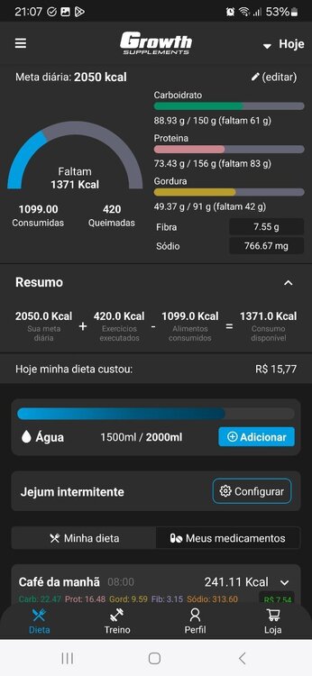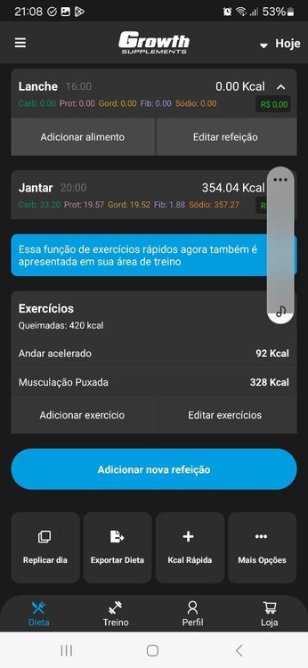 Boa noite Dani, eu tenho o aplicativo da Growth para calculo de macros…confesso que não tenho marcado lá nos últimos dias. Eu estava fazendo o cálculo de acordo com o meu metabolismo basal que é de 1252Kcal Eu tenho dificuldade em definir meu peso ideal. Por exemplo, hoje eu peso 54kg mas preciso perder gordura pq minha gordura corporal ainda é alta(25.40%) e ao mesmo tempo preciso ganhar massa muscular. De qualquer forma vou fazer, com as ferramentas que tenho aqui. Beijos, Stela☺️1 ponto