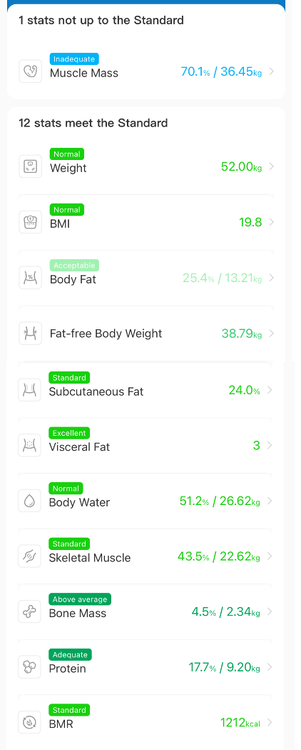 Bom dia pessoal! Também comecei ontem o desafio Meus cálculos baseados nas diretrizes do post: Peso ideal: 50kg (atual 52) Valor de manutenção: 1750 kcal Valor para perda de gordura: entre 1400 e 1575 kcal Consumo: 120g de proteínas (40g por refeição) 50g de gorduras (considerei 1.0 no cálculo pra ter uma base) 120g de carboidrato (40g por refeição) PESO: 50,0 kg. Me pesei na manhã do dia 17. Tenho uma balancinha de bioimpedância mas não consigo sincronizar a danada nem por nada com os demais apps 🫠 vou postar a composição corporal atual abaixo. TREINO: Treino de Força, membros superiores (não tenho ainda um tracker, chuto 150kcal, teremos imagens num futuro próximo hihi) MACROS BATIDOS: 92g proteína; 105g carboidrato; 39g gordura; 1070 calorias. Minhas impressões do primeiro dia: como podem ver, falhei fortemente em bater os macros. Ontem foi um dia super cansativo e eu pulei a janta, só queria banho e cama. Resultado: a herdeira guerreira acordou as 3 da manhã com a barriga roncando! Acho que se eu tivesse jantado chegaria perto, mas confesso que durante o dia todo fiquei muito intencional nas quantidades de proteína, caso contrário ia ficar mais longe ainda. Seguimos, hoje é um novo dia 😅 Fotos: PS: meu app MyFitnessPal cria o próprio “daily goal” por isso na tabela é um pouco diferente do nosso cálculo2 pontos