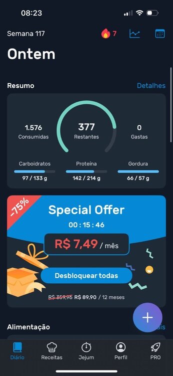 Oi, parceira @Natália Teixeira Pra mim esta sendo ótimo vir aqui e pensar sobre o meu dia de ontem. No fim acabo não refletindo só sobre o que comi, mas várias outras coisas. Ontem 23/07, sexto dia de desafio, fiz frango desfiado e foi frango no almoço, tarde e frango a noite, fiz 4 refeições. Não comi doce e bebi mais de 3L de água. Meta de consumo diário: 147g de proteínas, máximo 87g de gordura, 90g de carboidrato, máximo de calorias 1.953. MACROS BATIDOS: 142g proteína; 97g carboidrato; 66g gordura; 1.576calorias. PESO: 69.3KG TREINO: Esteira só. FOTOS:1 ponto