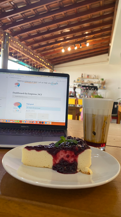 Vim trabalhar numa cafeteria perto de casa. Aproveitei e vim andando para tomar um sol, já que eu não saio de casa e raramente tomo sol rsrs Tomando um café gelado e comendo uma cheesecake enquanto termino de preencher a ferramenta da pesquisa de copy do Renato e construo a oferta irrecusável! Feliz dia das herdeiras 👑5 pontos