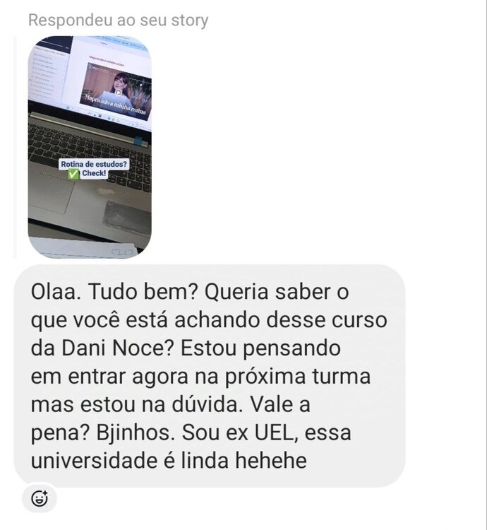 Bom dia! Hoje quero compartilhar algo que está acontecendo com certa frequência. De tanto que eu coloco nos stories que estou estudando o método e falo como ele tem me ajudado na rotina, criação de hábitos, etc. estão vindo muitas pessoas, todos os dias, querer saber o que eu realmente acho dele, pois estão querendo comprar o curso. Alunas e ex alunos da UEL, alunos dos meus cursos de tricô e crochê, amigurumi, etc. Eu ainda não sou embaixadora nem nada e não tenho link, então eu só direciono elas para a página do instagram do PMP, após falar maravilhas desse curso rsrs. Agora a dica: Para você que é embaixadora, que tal começar a falar mais sobre como o método ajudou na sua rotina de modo mais intencional, com exemplos reais. Isso se você anda não faz! rsrsrs Por exemplo, antes de colocar o link do PMP, fale em como ele te ajudou a sair de uma situação. Eu estava fazendo a rotina do hábito pelo meu insta, então eu postava a foto com o check do hábito, que está lá na aula do desafio do hábito, e logo em seguida o hábito concluído, TODOS OS DIAS, por 7 dias fiz isso. Com a academia também e daí eu falava sobre como o curso me ajudou a adquirir bons hábitos e a me livrar dos ruins, explicava do meu jeito o que seria o hábito angular e empilhamento de hábitos e sempre deixava um gsotinho de quero mais, sempre vinham me perguntar e eu dizia, para saber mais, faça o curso, porque eu não sou professora, sou apenas uma aluna e acho que você vai aprender melhor com quem realmente sabe e aplica isso há anos, eu estou aplicando apenas há 1 mês. E aí vem o tcham, quando eu digo "apenas 1 mês", elas ficam maravilhadas, como assim? Só há 1 mês e já conseguiu reorganizar tudo! Na imagem, essa conversa foi hoje! É isso! Espero ter ajudado! E agora me diga o que você faz para divulgar o curso, pode ser que ajude mais pessoas! =D1 ponto